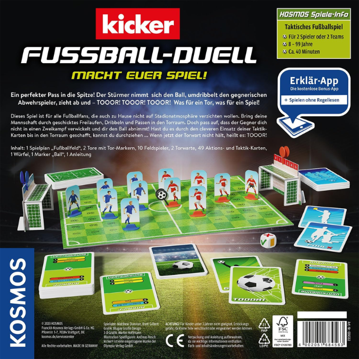 Mach dein Spiel! Das kicker Fußball-Duell bringt Stadion-Atmosphäre direkt auf euren Tisch. Dieses spannende Familienspiel für 2–4 Spieler ab 8 Jahren kombiniert taktisches Denken mit Fußball-Action – ganz ohne Regellesen dank der kostenlosen KOSMOS Erklär-App.