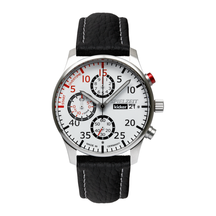 Entwickelt vom Uhren-Spezialisten POINTtec und ausgestattet mit einem präzisen Citizen/MIYOTA-Quarzwerk mit 20stel-Sekunden-Chronograph – Qualität „Made in Germany“. Abseits des Platzes überzeugt die sportlich-edle Uhr mit Kalenderanzeige, kratzfestem K1-Sicherheitsglas, schwarzem Lederarmband mit Faltschließe und 100 m Wasserdichte. Leuchtzeiger sorgen auch im Dunkeln für optimale Ablesbarkeit.