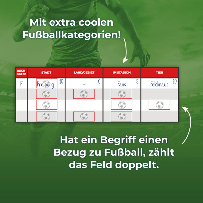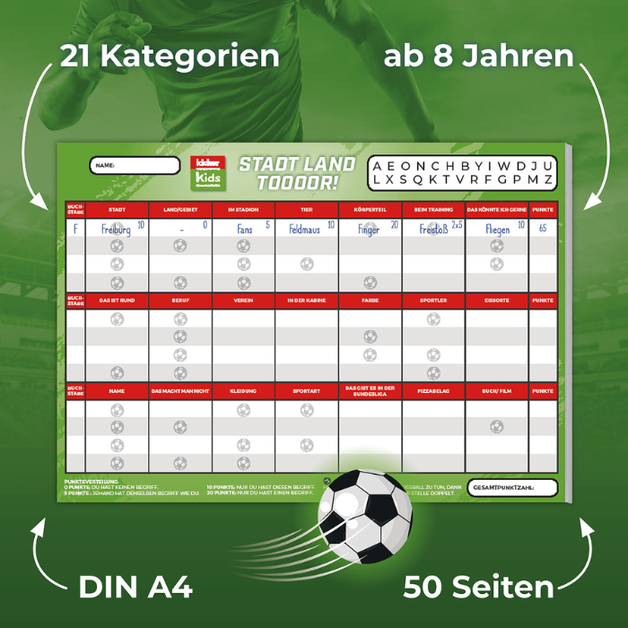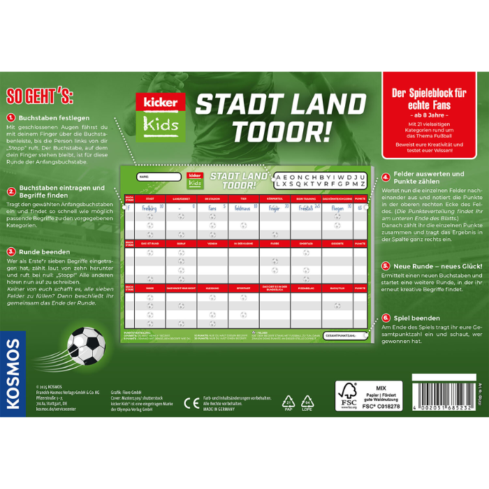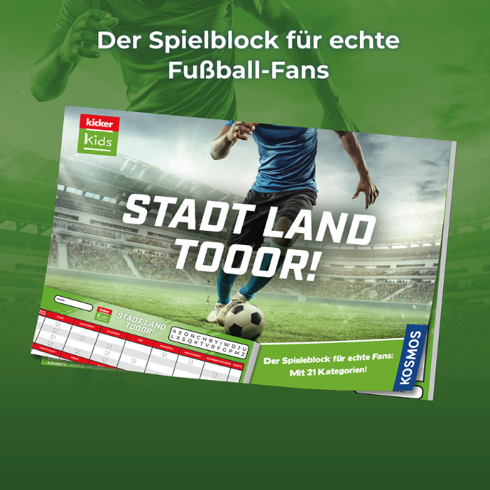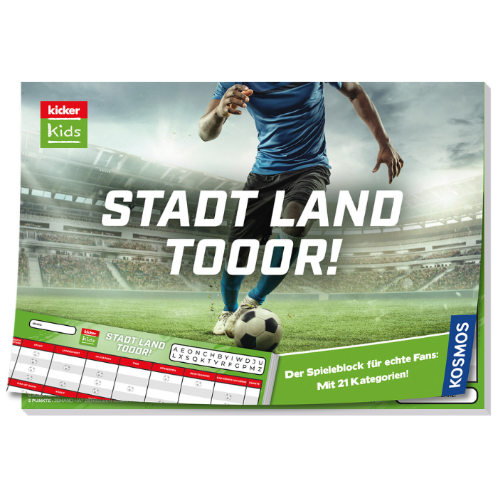 Mit „kicker Kids: Stadt – Land – Tor!“ bringt der Kosmos Verlag frischen Wind in den Spieleklassiker „Stadt, Land, Fluss“. Dieses Spiel kombiniert das bewährte Spielprinzip mit 21 neuen, fußballbezogenen Kategorien und sorgt so für spannenden Ratespaß. Ob Spielername, Stadion oder Fußballspruch – hier sind Schnelligkeit, Kreativität und Fußballwissen gefragt.